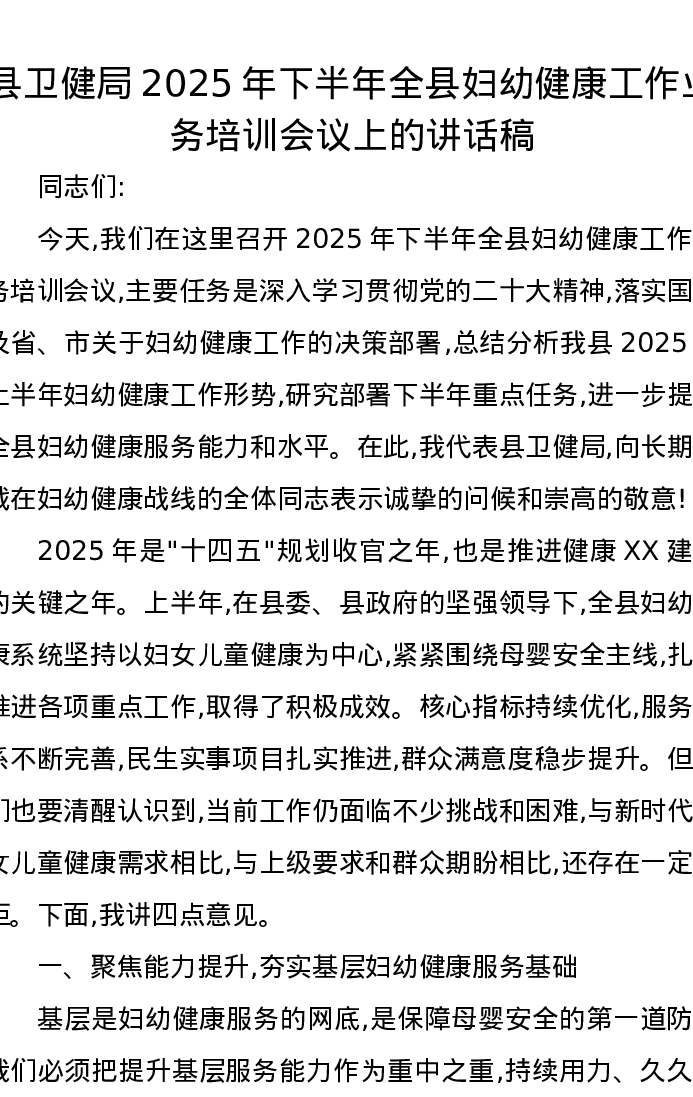 县卫健局2025年下半年全县妇幼健康工作业务培训会议上的讲话稿