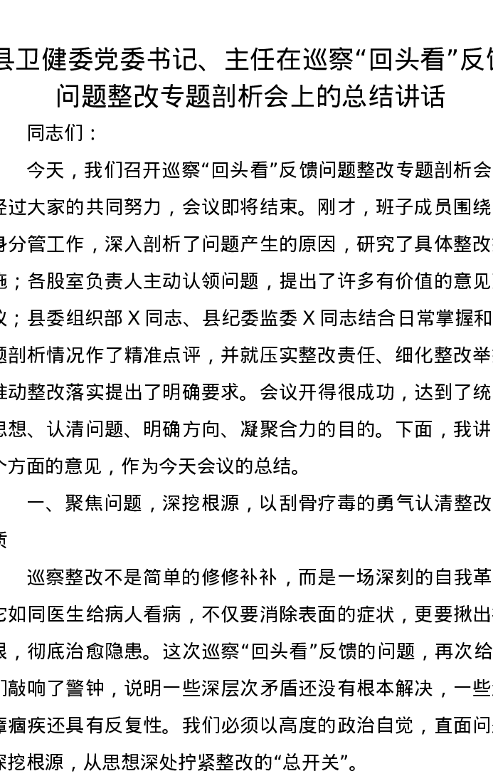 县卫健委党委书记、主任在巡察“回头看”反馈问题整改专题剖析会上的总结讲话
