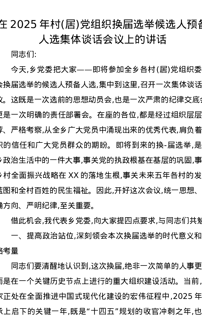 在2025年村(居)党组织换届选举候选人预备人选集体谈话会议上的讲话