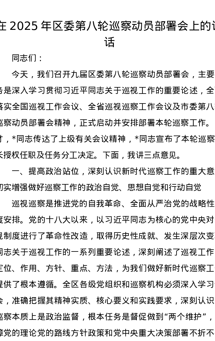 在2025年区委第八轮巡察动员部署会上的讲话