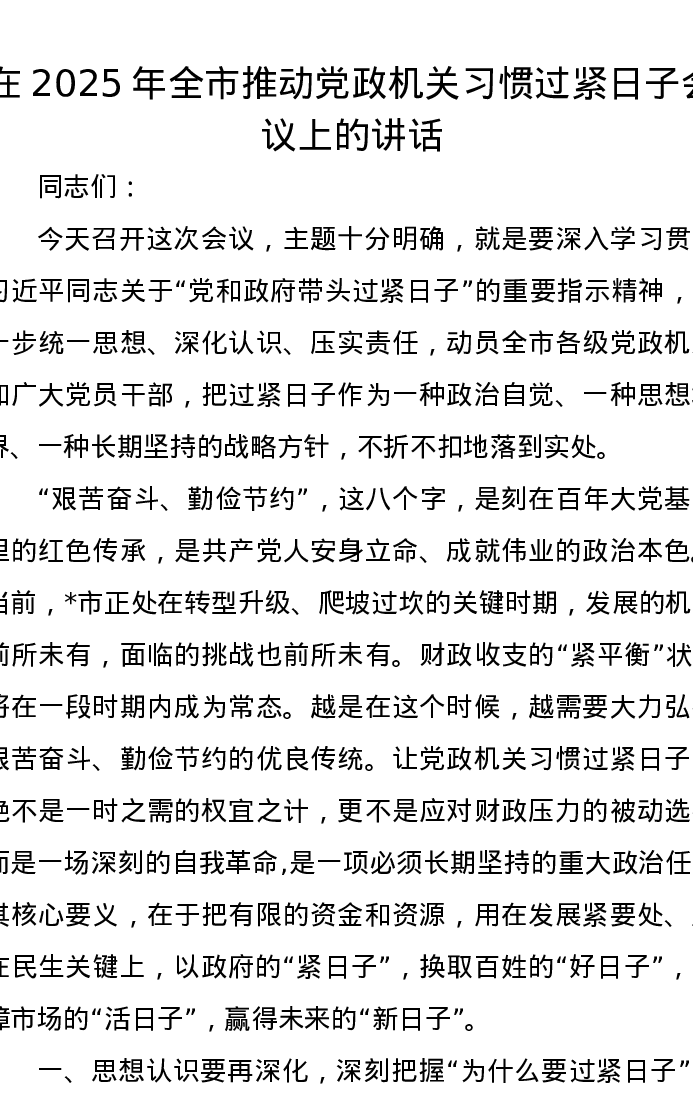 在2025年全市推动党政机关习惯过紧日子会议上的讲话