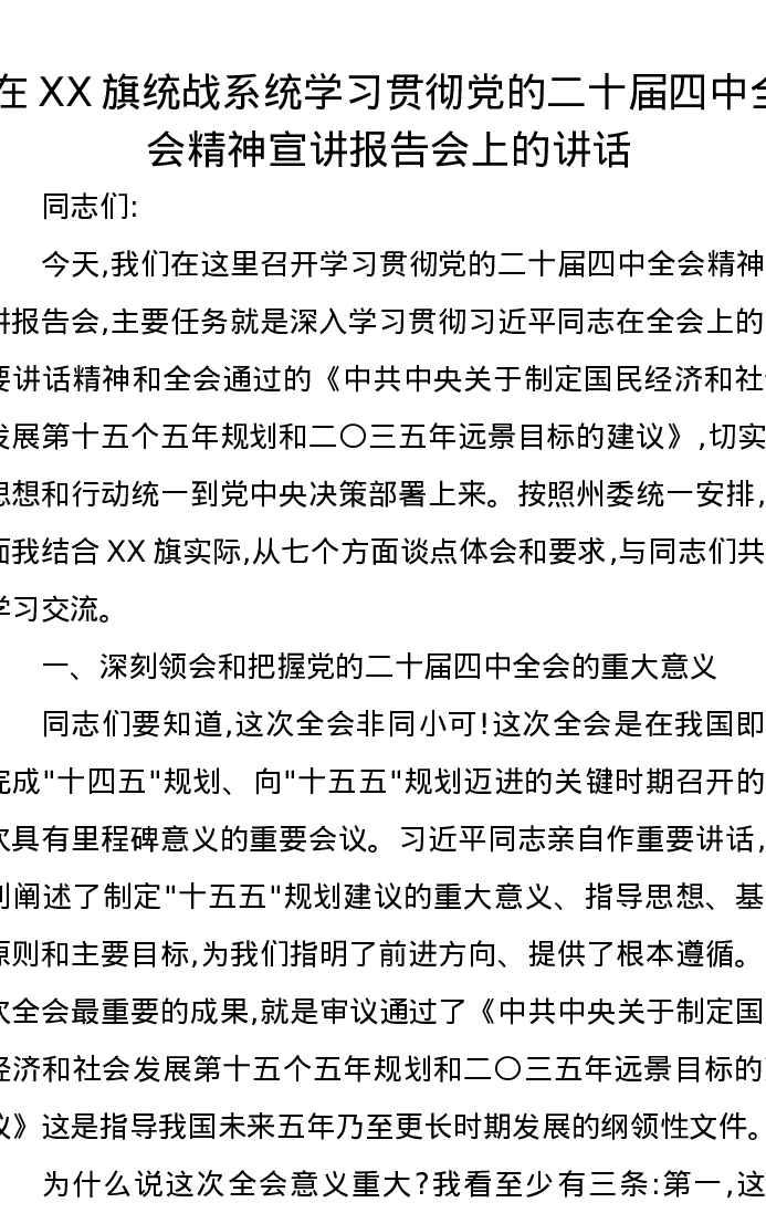 在XX旗统战系统学习贯彻党的二十届四中全会精神宣讲报告会上的讲话