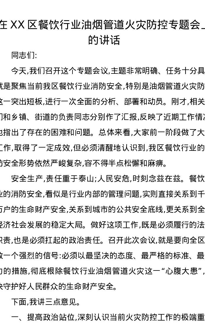 在XX区餐饮行业油烟管道火灾防控专题会上的讲话