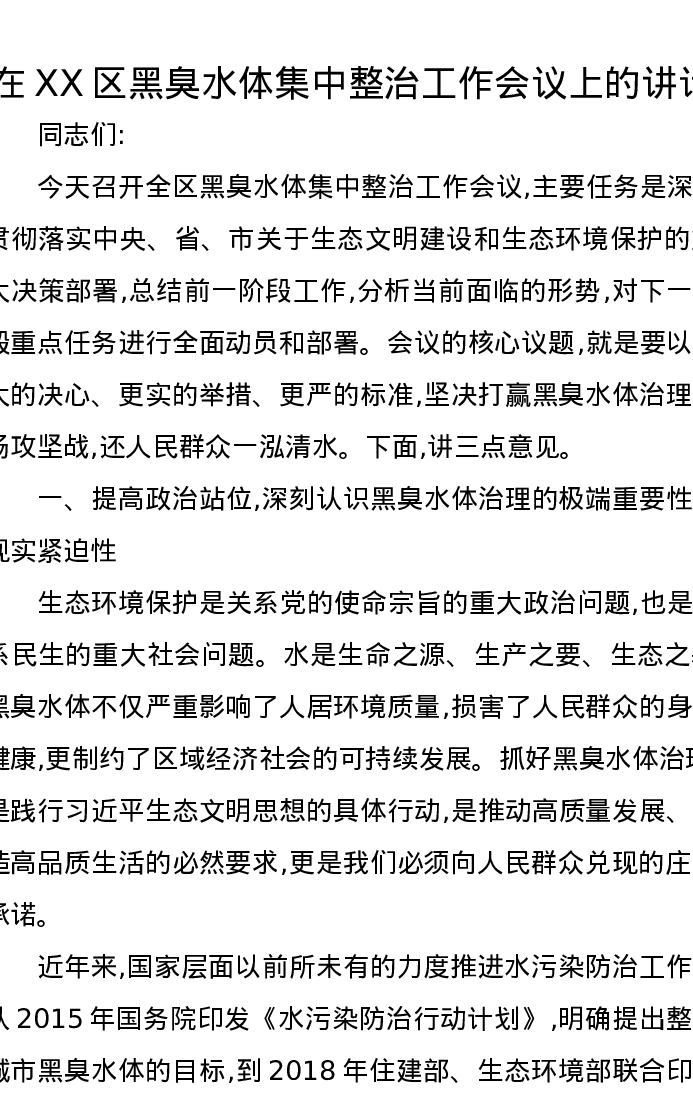 在XX区黑臭水体集中整治工作会议上的讲话