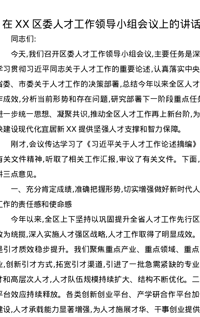 在XX区委人才工作领导小组会议上的讲话