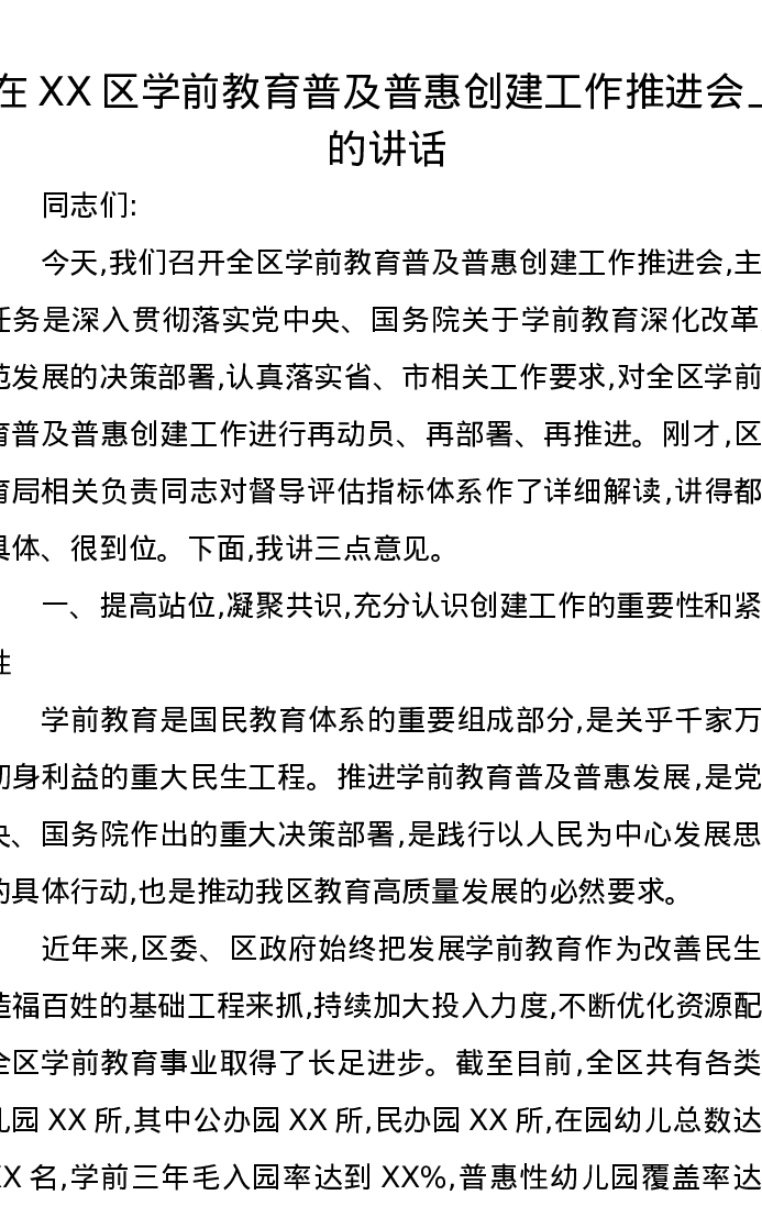 在XX区学前教育普及普惠创建工作推进会上的讲话