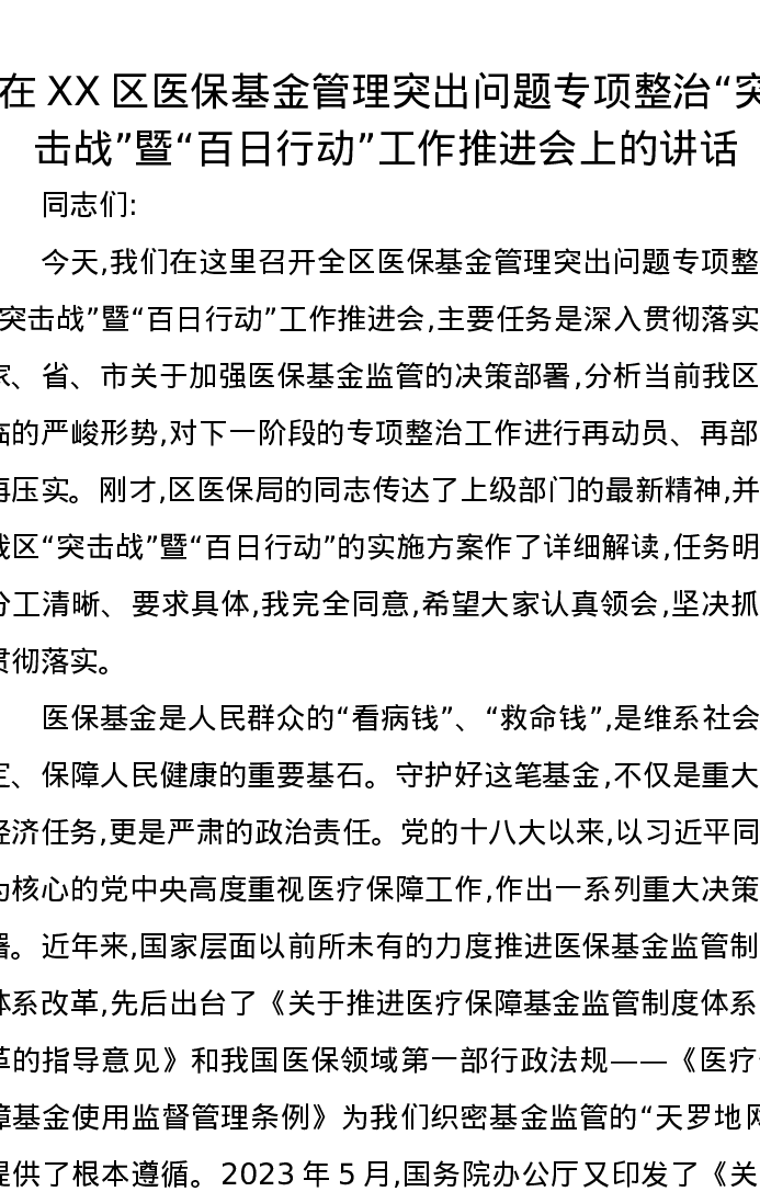 在XX区医保基金管理突出问题专项整治“突击战”暨“百日行动”工作推进会上的讲话