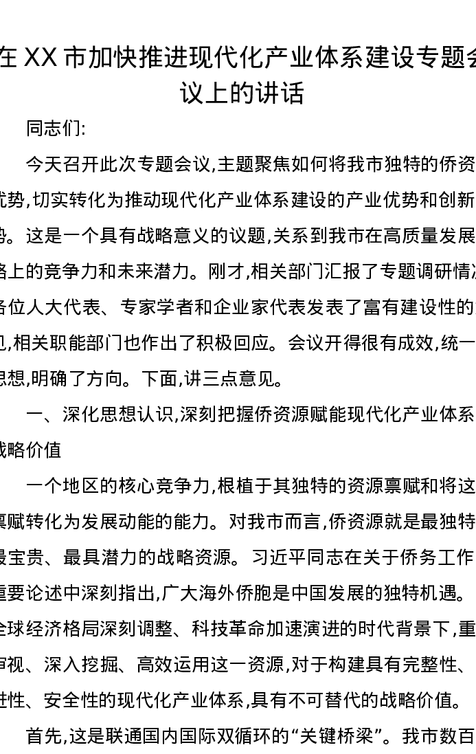 在XX市加快推进现代化产业体系建设专题会议上的讲话