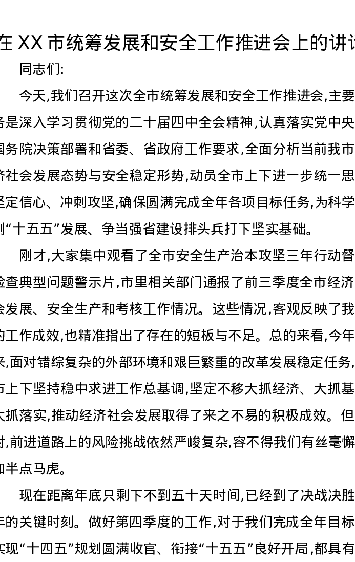 在XX市统筹发展和安全工作推进会上的讲话