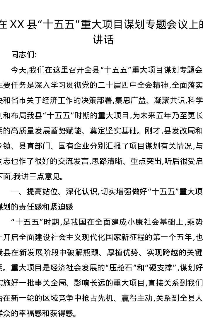 在XX县“十五五”重大项目谋划专题会议上的讲话