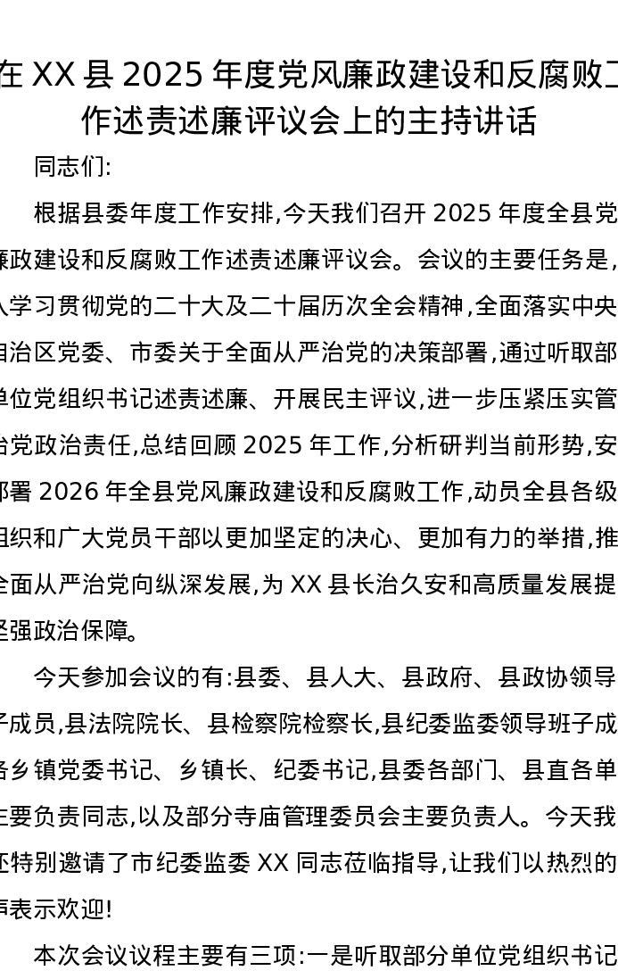 在XX县2025年度党风廉政建设和反腐败工作述责述廉评议会上的主持讲话