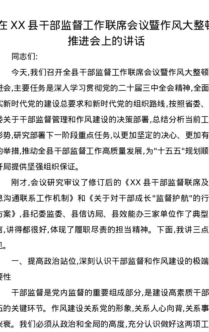 在XX县干部监督工作联席会议暨作风大整顿推进会上的讲话