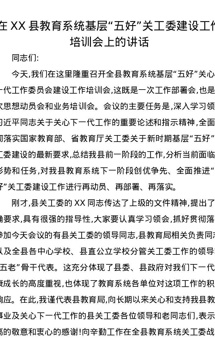 在XX县教育系统基层“五好”关工委建设工作培训会上的讲话