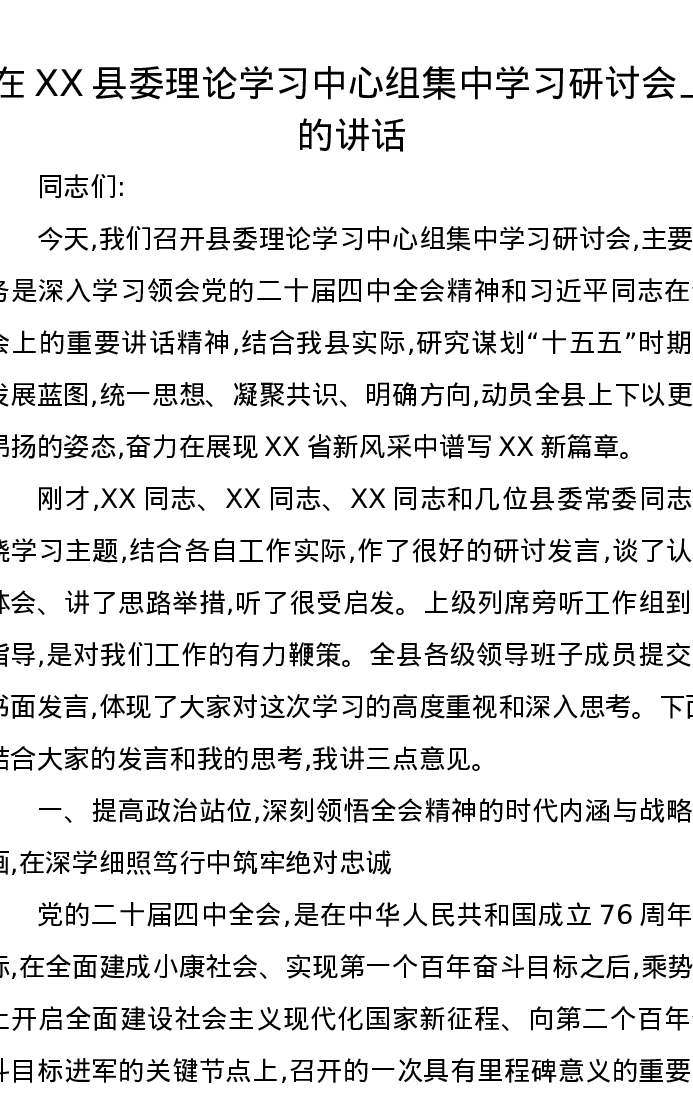 在XX县委理论学习中心组集中学习研讨会上的讲话