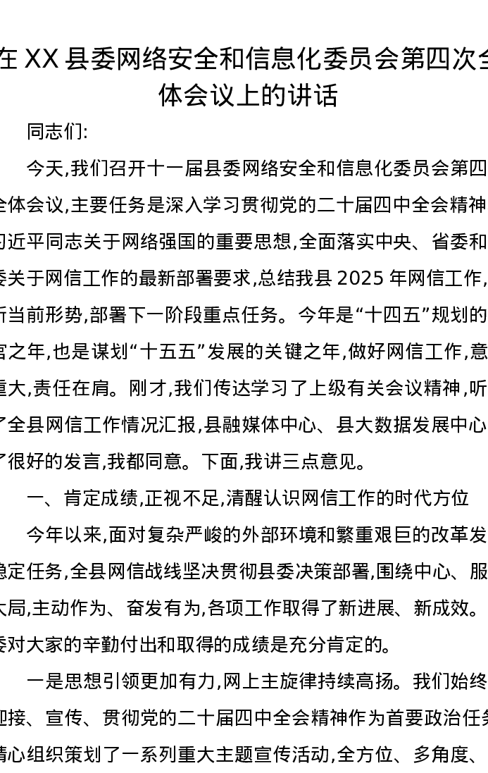 在XX县委网络安全和信息化委员会第四次全体会议上的讲话
