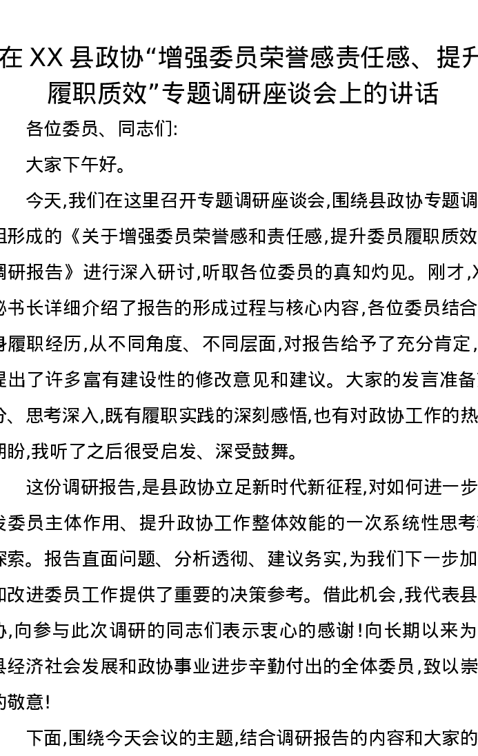 在XX县政协“增强委员荣誉感责任感、提升履职质效”专题调研座谈会上的讲话