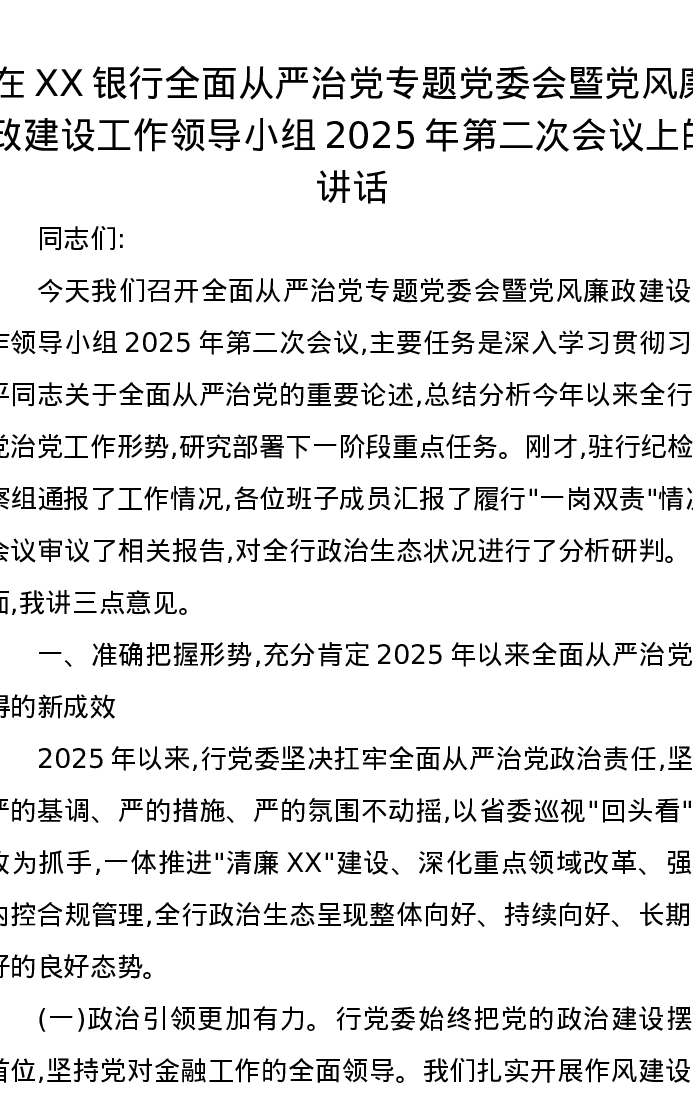 在XX银行全面从严治党专题党委会暨党风廉政建设工作领导小组2025年第二次会议上的讲话