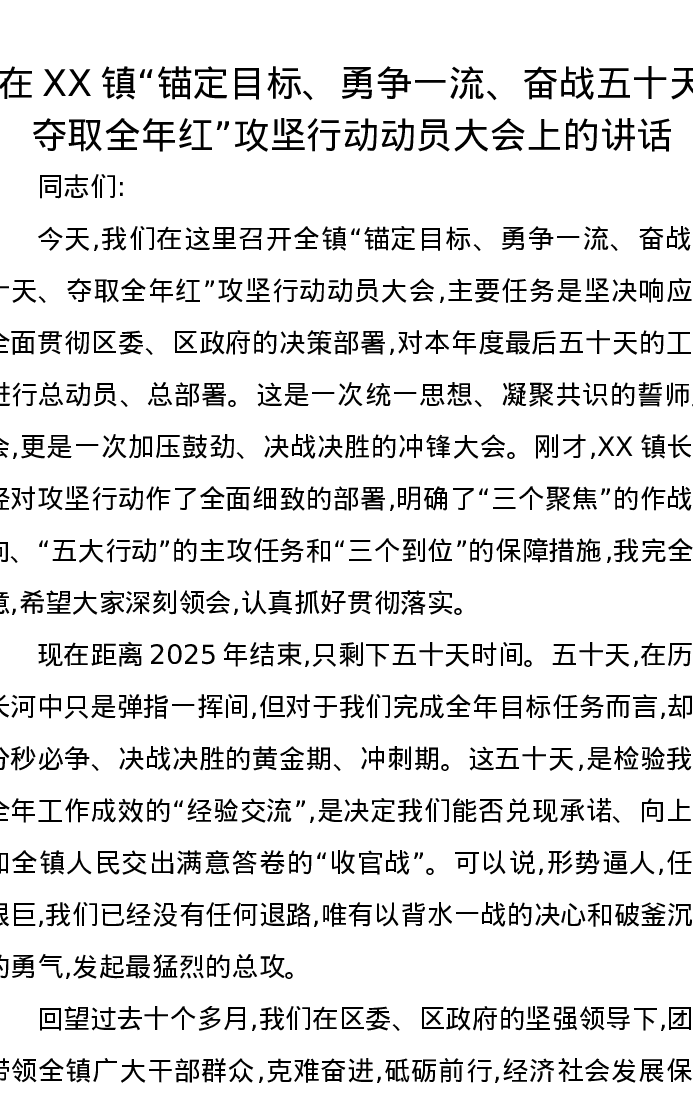 在XX镇“锚定目标、勇争一流、奋战五十天、夺取全年红”攻坚行动动员大会上的讲话