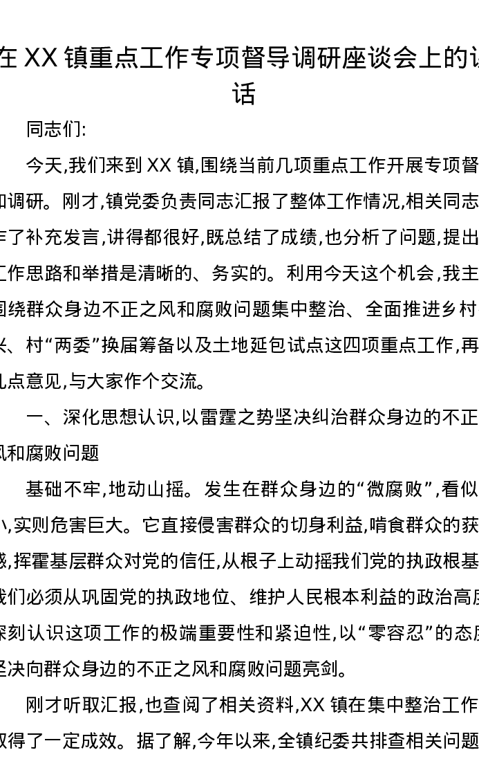 在XX镇重点工作专项督导调研座谈会上的讲话