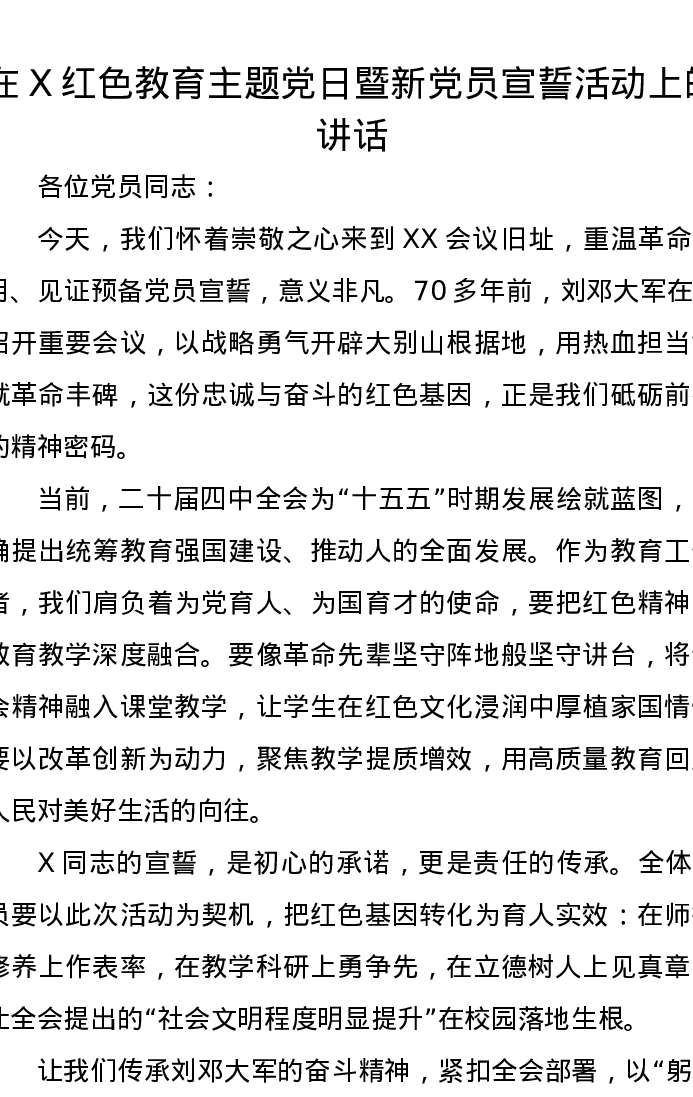 在X红色教育主题党日暨新党员宣誓活动上的讲话
