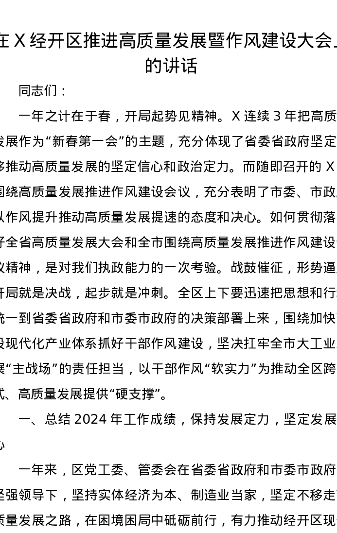 在X经开区推进高质量发展暨作风建设大会上的讲话