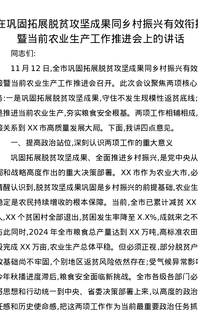 在巩固拓展脱贫攻坚成果同乡村振兴有效衔接暨当前农业生产工作推进会上的讲话