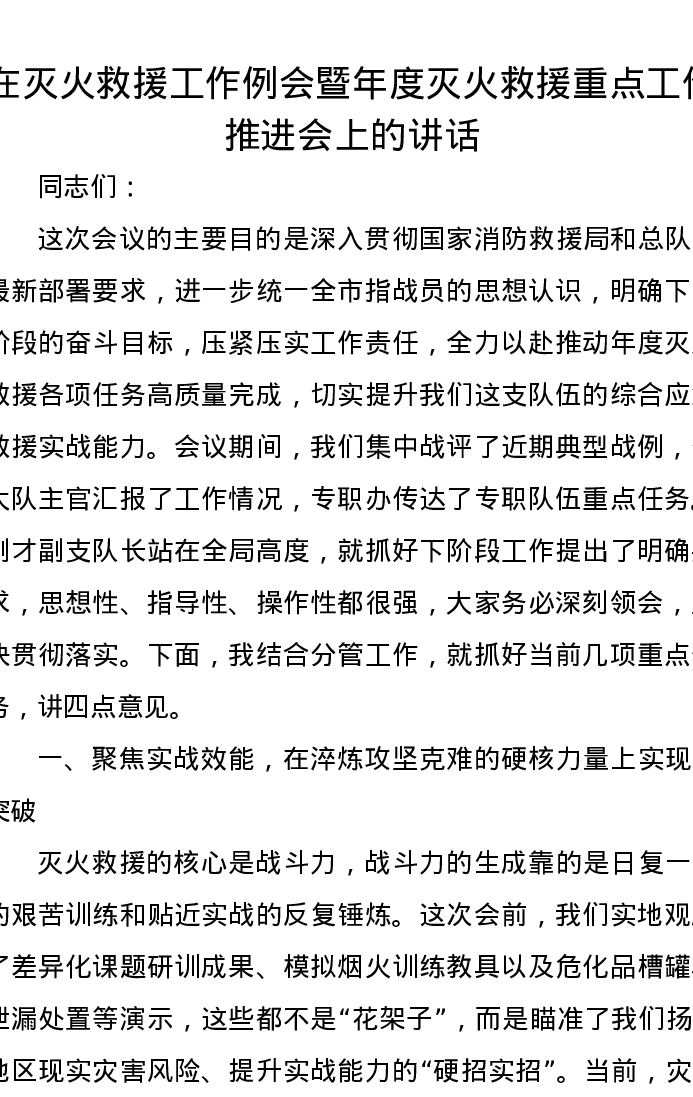 在灭火救援工作例会暨年度灭火救援重点工作推进会上的讲话