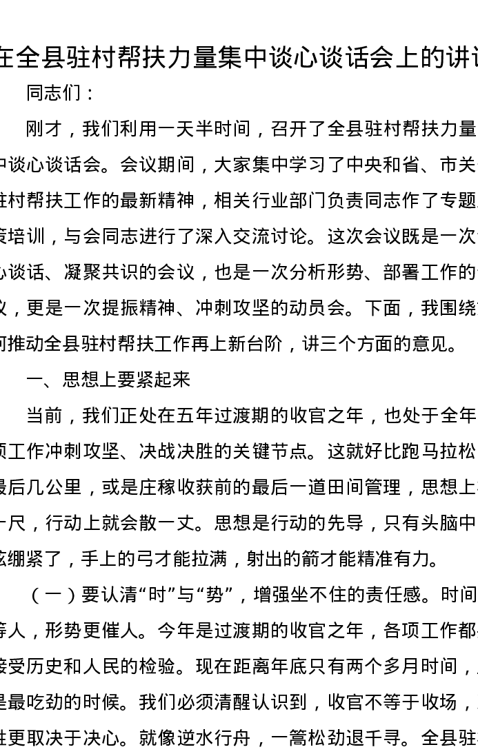 在全县驻村帮扶力量集中谈心谈话会上的讲话