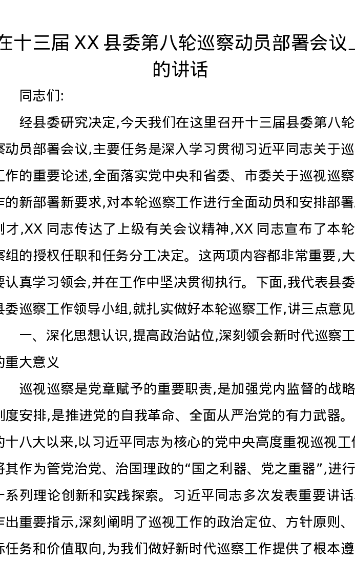 在十三届XX县委第八轮巡察动员部署会议上的讲话