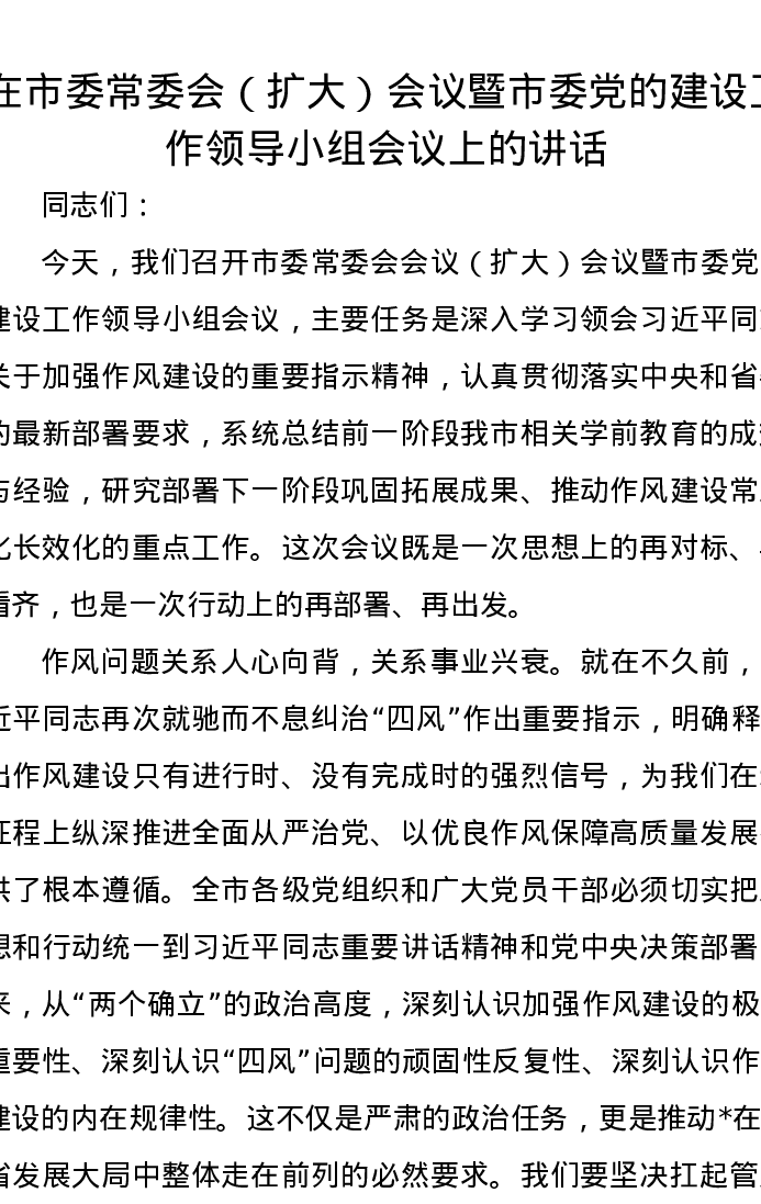 在市委常委会(扩大)会议暨市委党的建设工作领导小组会议上的讲话