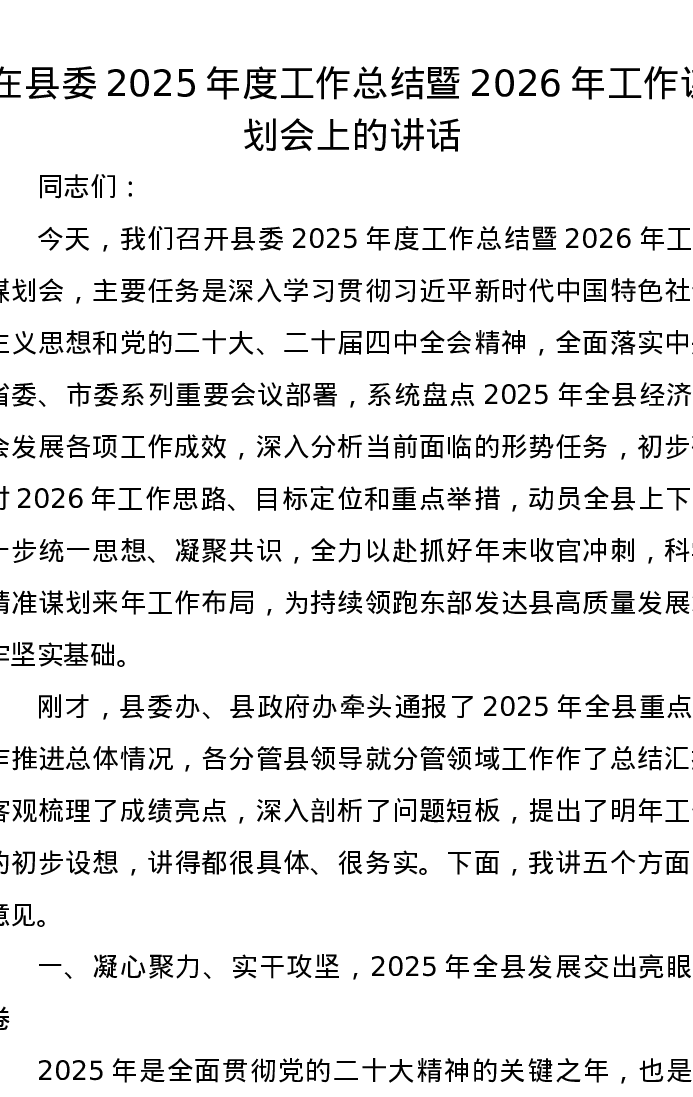 在县委2025年度工作总结暨2026年工作谋划会上的讲话