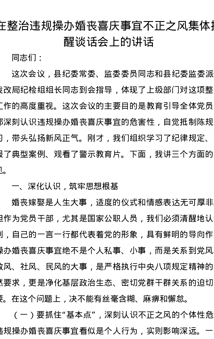 在整治违规操办婚丧喜庆事宜不正之风集体提醒谈话会上的讲话