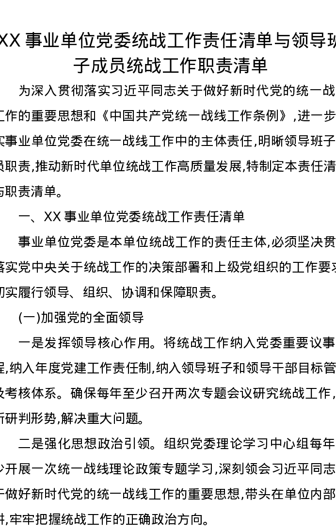 XX事业单位党委统战工作责任清单与领导班子成员统战工作职责清单