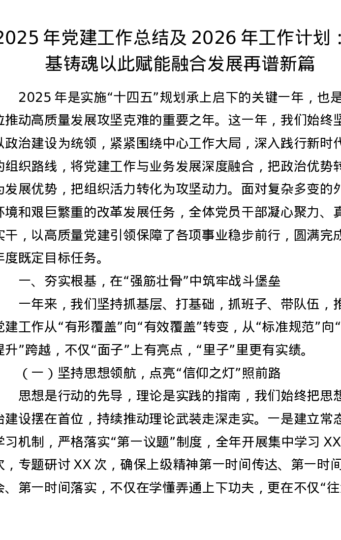 2025年党建工作总结及2026年工作计划:强基铸魂以此赋能 融合发展再谱新篇
