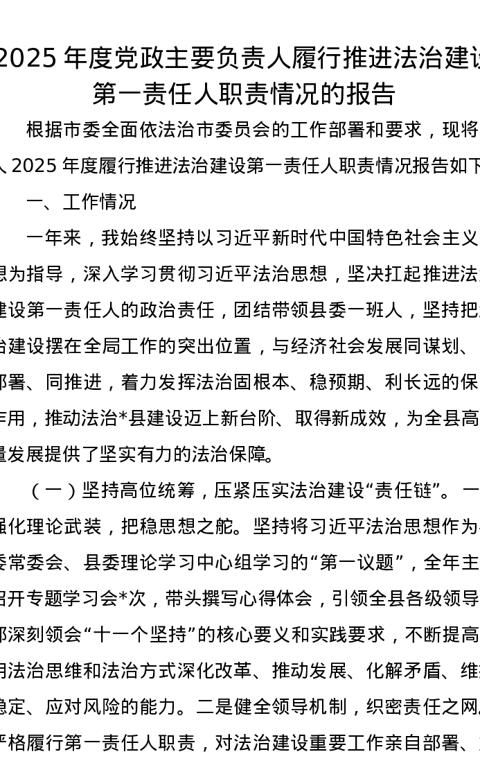 2025年度党政主要负责人履行推进法治建设第一责任人职责情况的报告