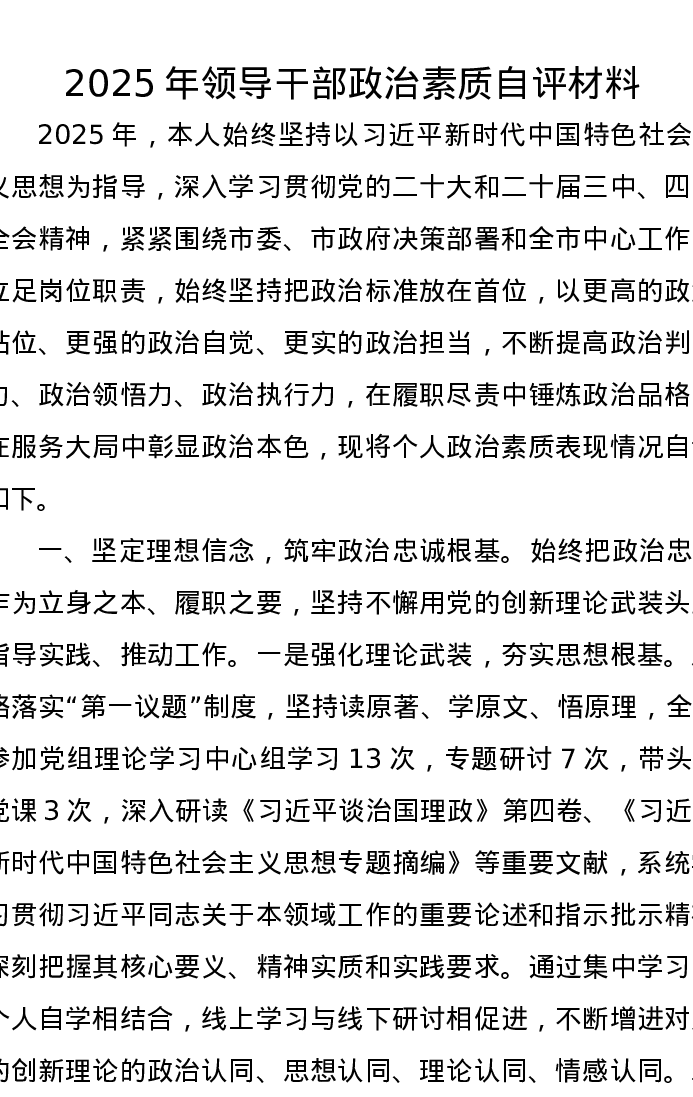 2025年领导干部政治素质自评报告材料