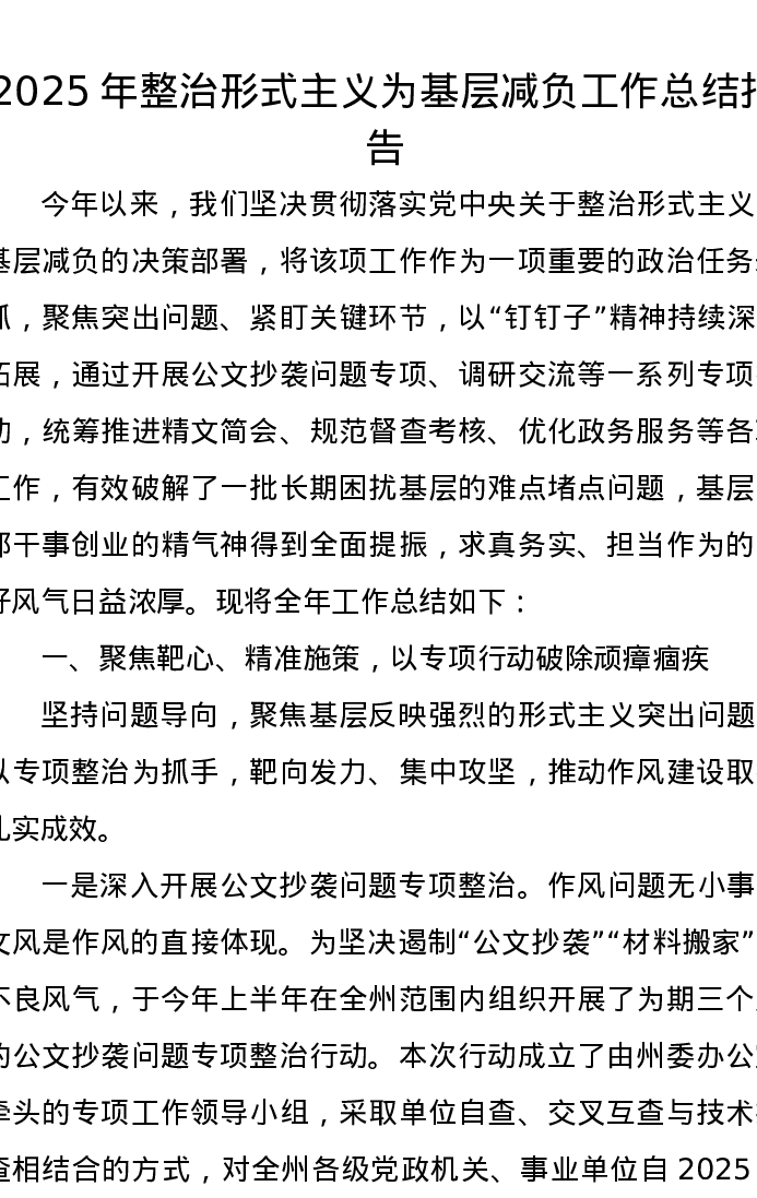 2025年整治形式主义为基层减负工作总结报告