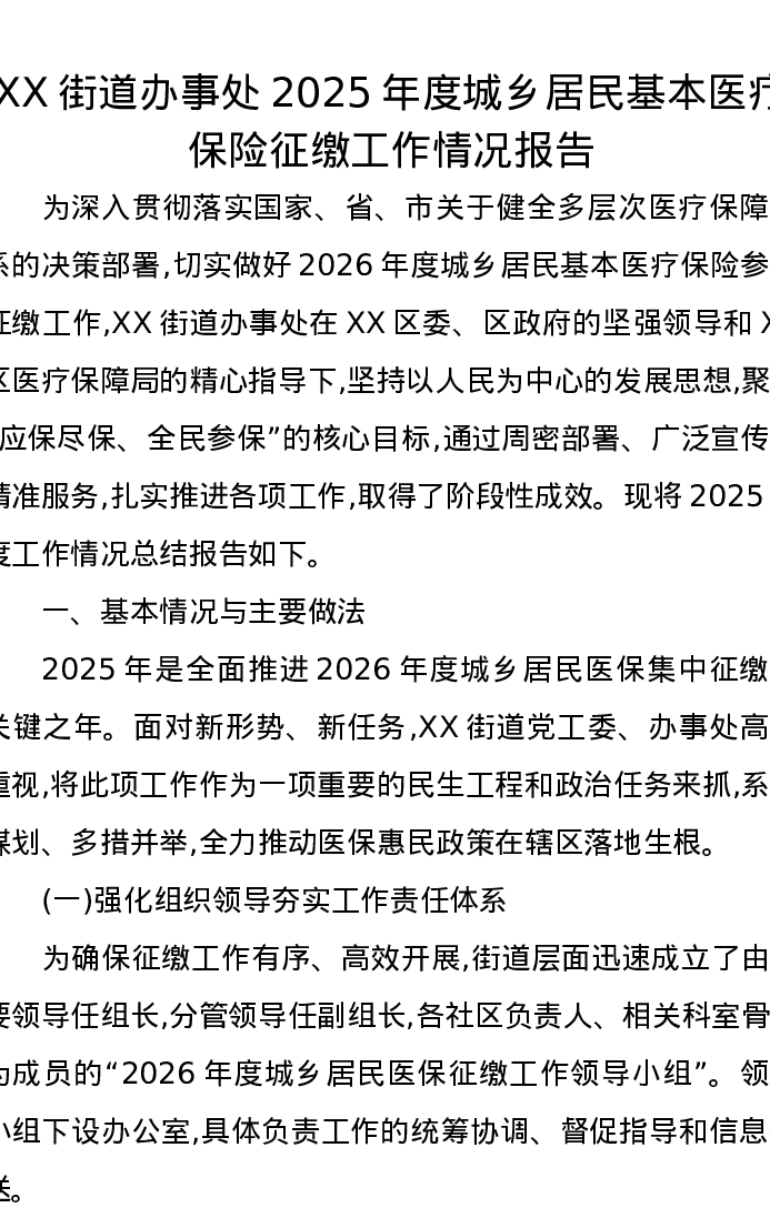 XX街道办事处2025年度城乡居民基本医疗保险征缴工作情况报告
