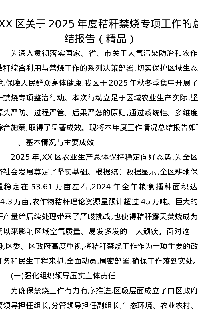 XX区关于2025年度秸秆禁烧专项工作的总结报告