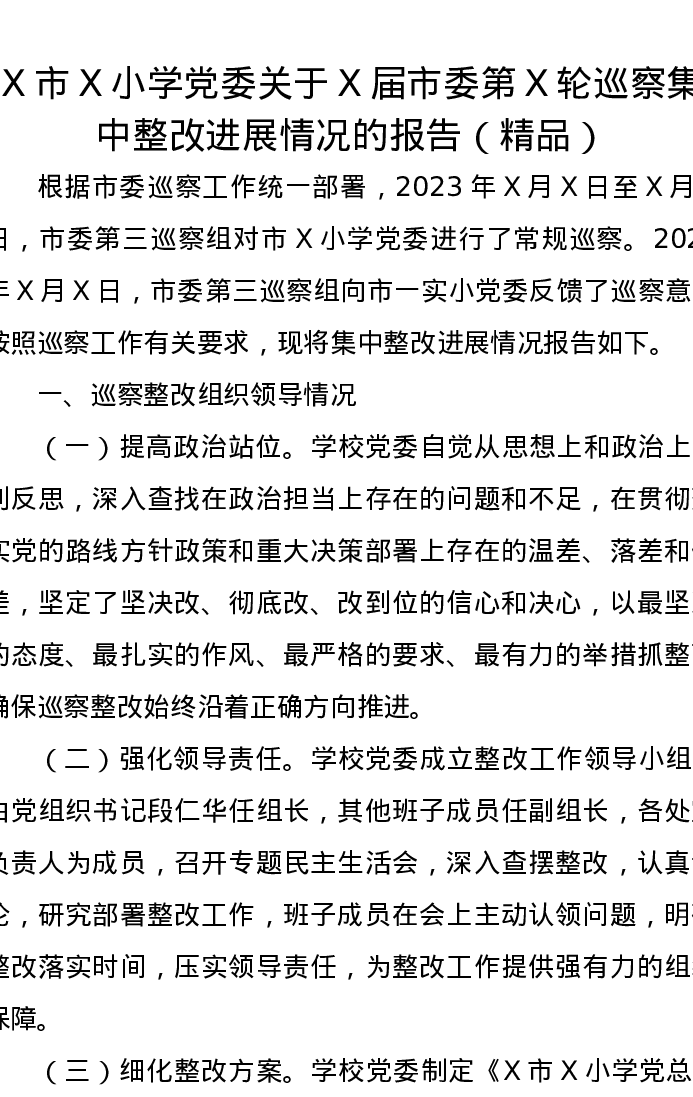 X市X小学党委关于X届市委第X轮巡察集中整改进展情况的报告