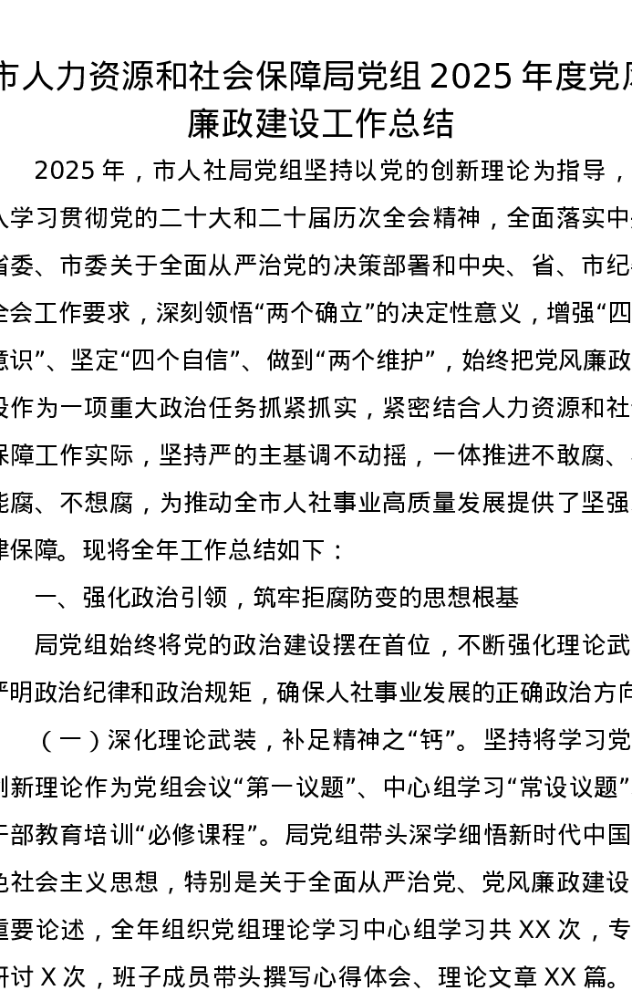 市人力资源和社会保障局党组2025年度党风廉政建设工作总结