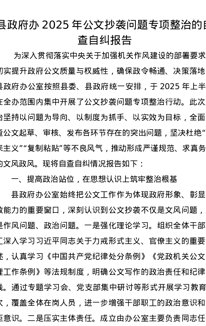 县政府办2025年公文抄袭问题专项整治的自查自纠报告