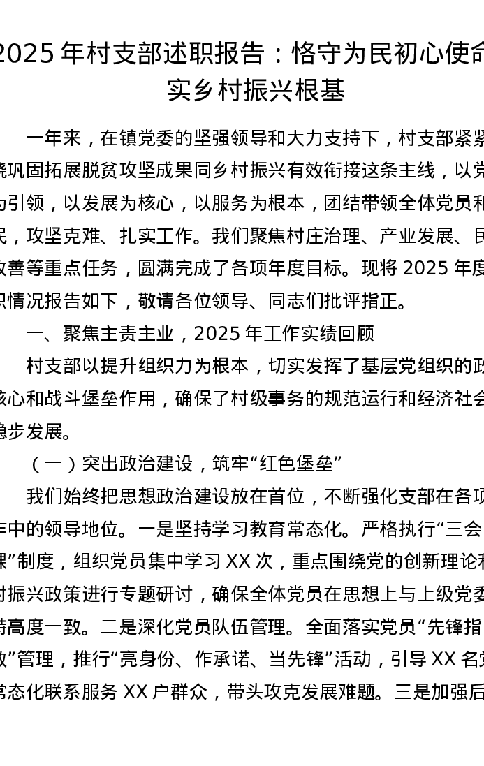 2025年村支部述职报告:恪守为民初心使命 夯实乡村振兴根基