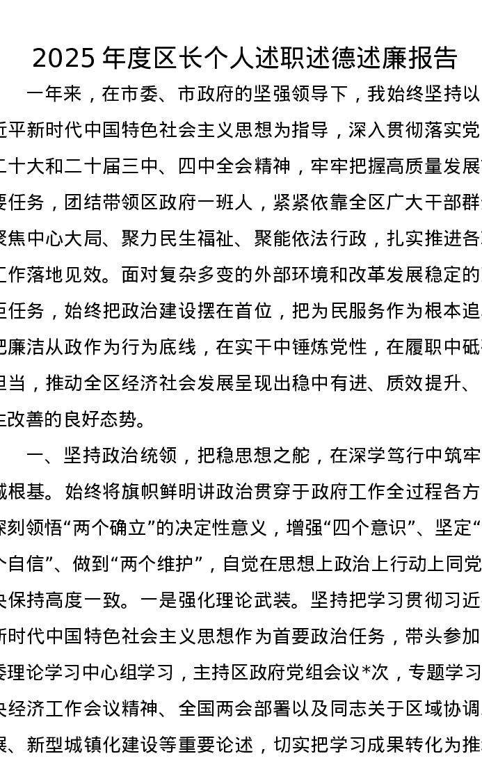 2025年度区长个人述职述德述廉报告