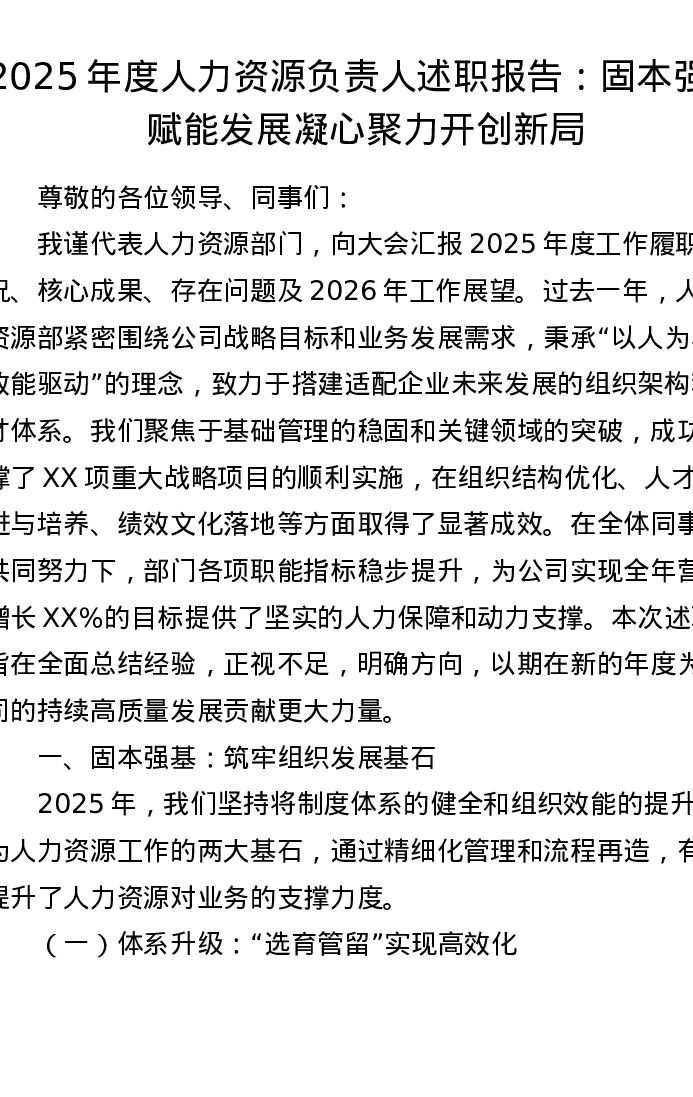 2025年度人力资源负责人述职报告:固本强基赋能发展 凝心聚力开创新局