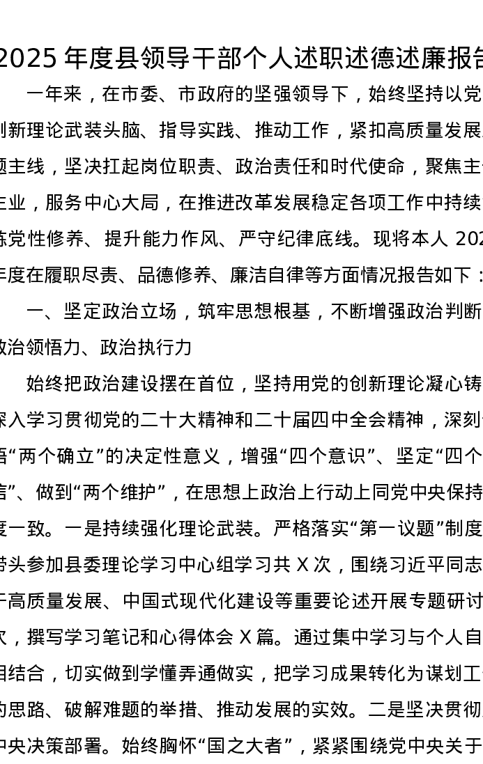 2025年度县领导干部个人述职述德述廉报告