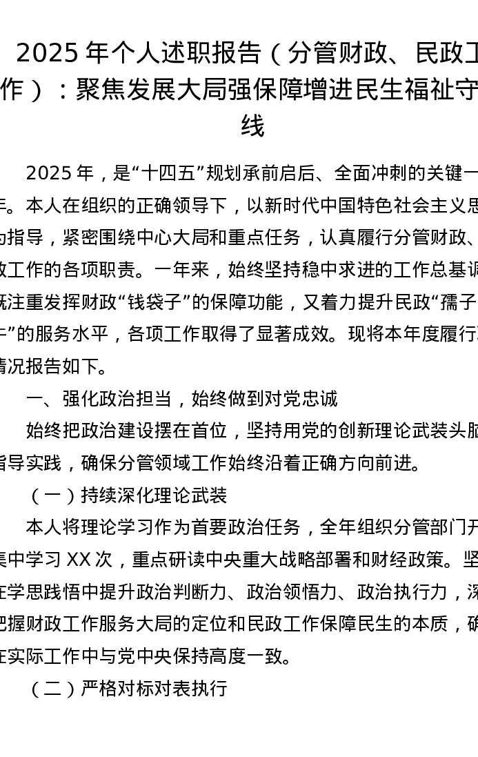 2025年个人述职报告(分管财政、民政工作):聚焦发展大局强保障 增进民生福祉守底线