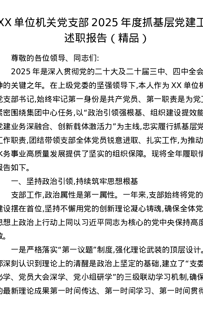 XX单位机关党支部2025年度抓基层党建工作述职报告
