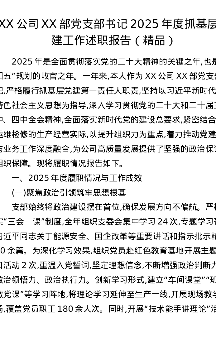 XX公司XX部党支部书记2025年度抓基层党建工作述职报告