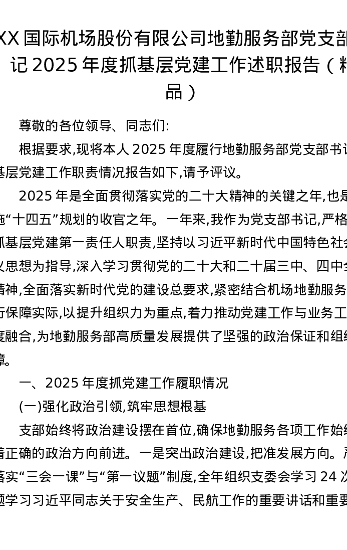 XX国际机场股份有限公司地勤服务部党支部书记2025年度抓基层党建工作述职报告